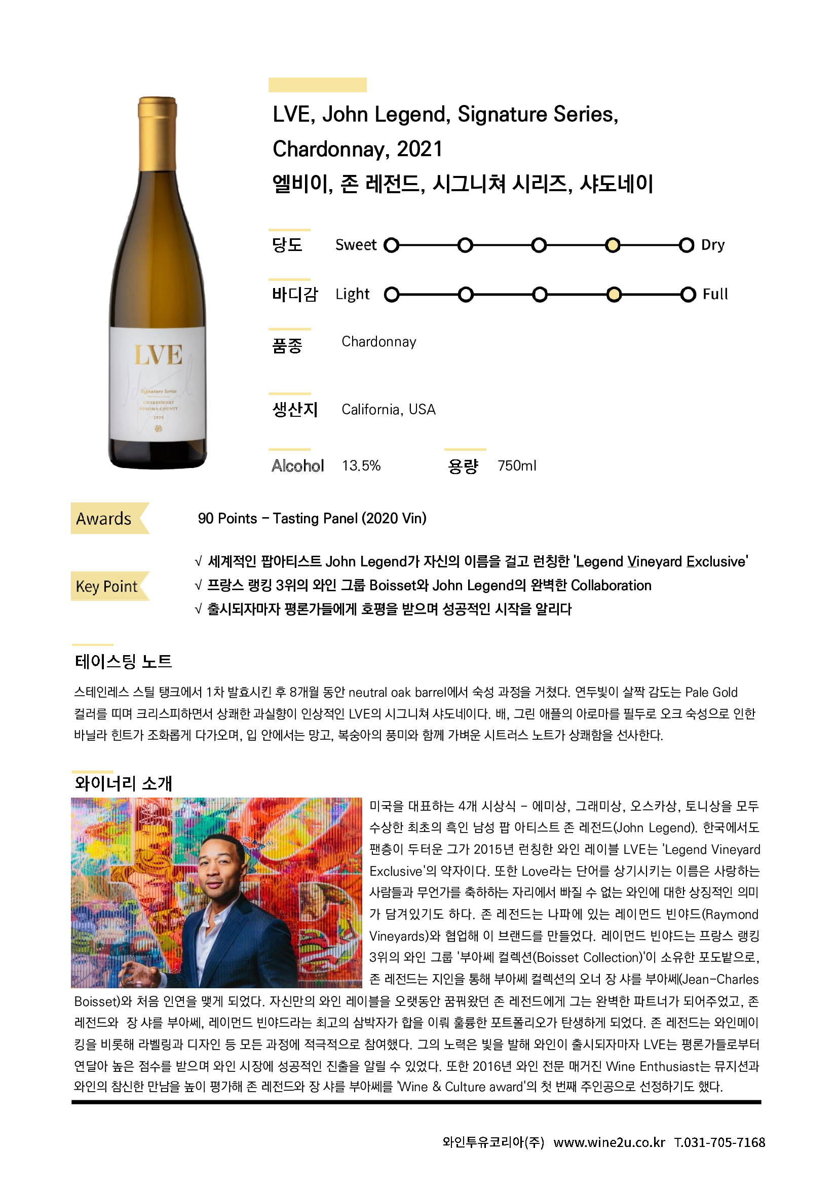 연두빛이 살짝 감도는 Pale Gold 컬러를 띠며 크리스피하면서 상쾌한 과실향이 인상적인 LVE의 시그니쳐 샤도네이다.
