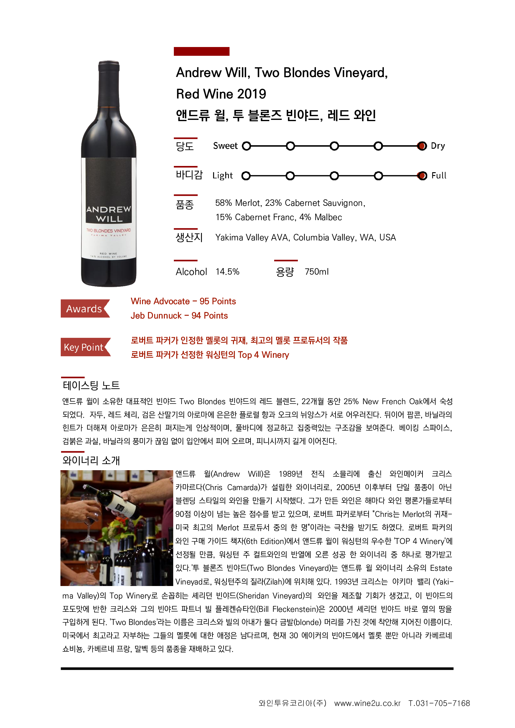 앤드류 윌(Andrew Will)은 1989년 전직 소믈리에 출신 와인메이커 크리스 카마르다(Chris Camarda)가 설립한 와이너리로, 2005년 이후부터 단일 품종이 아닌