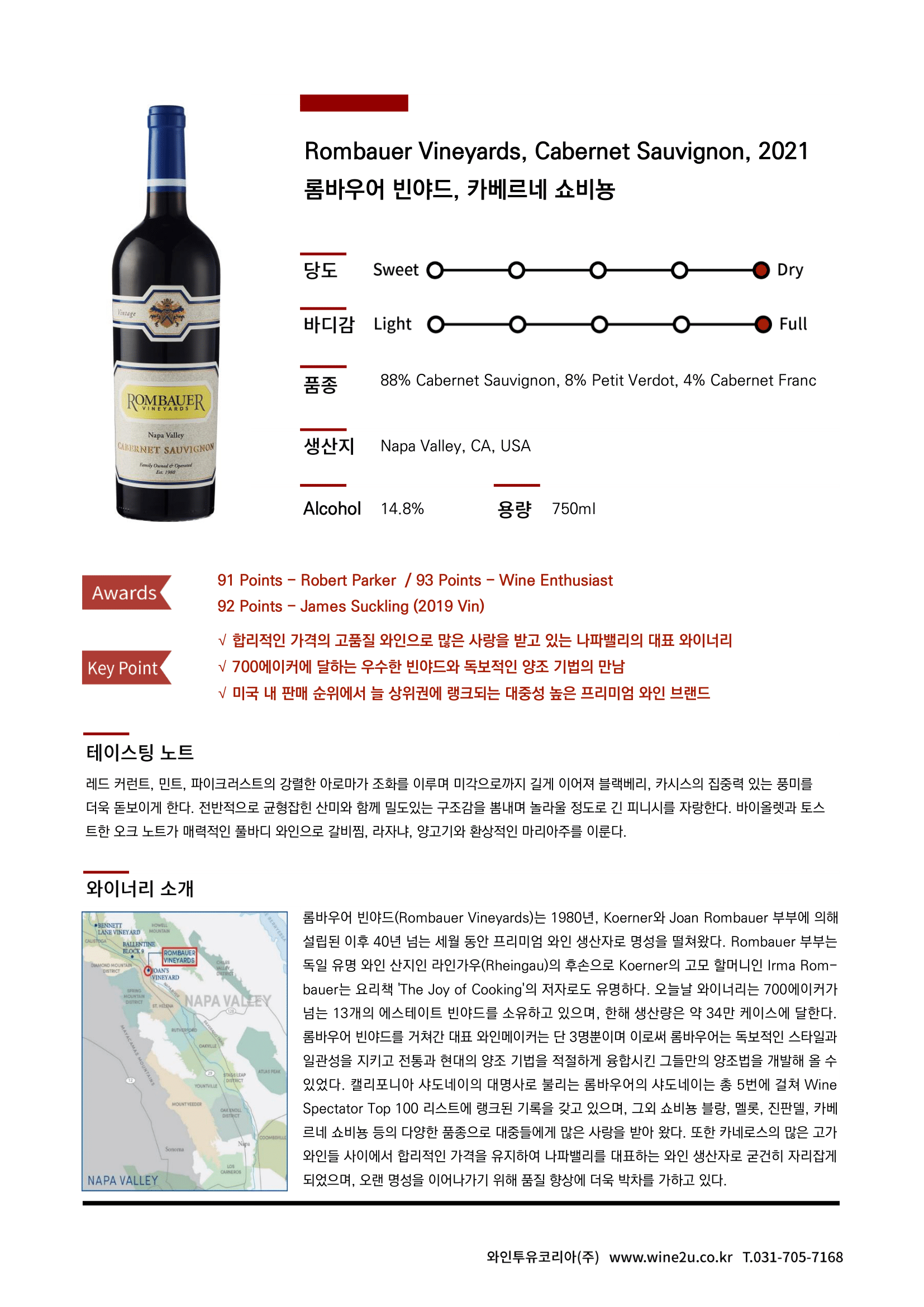 롬바우어 빈야드(Rombauer Vineyards)는 1980년, Koerner와 Joan Rombauer 부부에 의해 설립된 이후 40년 넘는 세월 동안 프리미엄 와인 생산자로 명성을 떨쳐왔다. Rombauer 부부는 독일 유명 와인 산지인 라인가우(Rheingau)의 후손으로 Koerner의 고모 할머니인 Irma Rom-bauer는 요리책 'The Joy of Cooking'의 저자로도 유명하다. 오늘날 와이너리는 700에이커가 넘는 13개의 에스테이트 빈야드를 소유하고 있으며, 한해 생산량은 약 34만 케이스에 달한다. 롬바우어 빈야드를 거쳐간 대표 와인메이커는 단 3명뿐이며 이로써 롬바우어는 독보적인 스타일과 일관성을 지키고 전통과 현대의 양조 기법을 적절하게 융합시킨 그들만의 양조법을 개발해 올 수 있었다. 캘리포니아 샤도네이의 대명사로 불리는 롬바우어의 샤도네이는 총 5번에 걸쳐 Wine Spectator Top 100 리스트에 랭크된 기록을 갖고 있으며, 그외 쇼비뇽 블랑, 멜롯, 진판델, 카베르네 쇼비뇽 등의 다양한 품종으로 대중들에게 많은 사랑을 받아 왔다. 또한 카네로스의 많은 고가 와인들 사이에서 합리적인 가격을 유지하여 나파밸리를 대표하는 와인 생산자로 굳건히 자리잡게 되었으며, 오랜 명성을 이어나가기 위해 품질 향상에 더욱 박차를 가하고 있다.