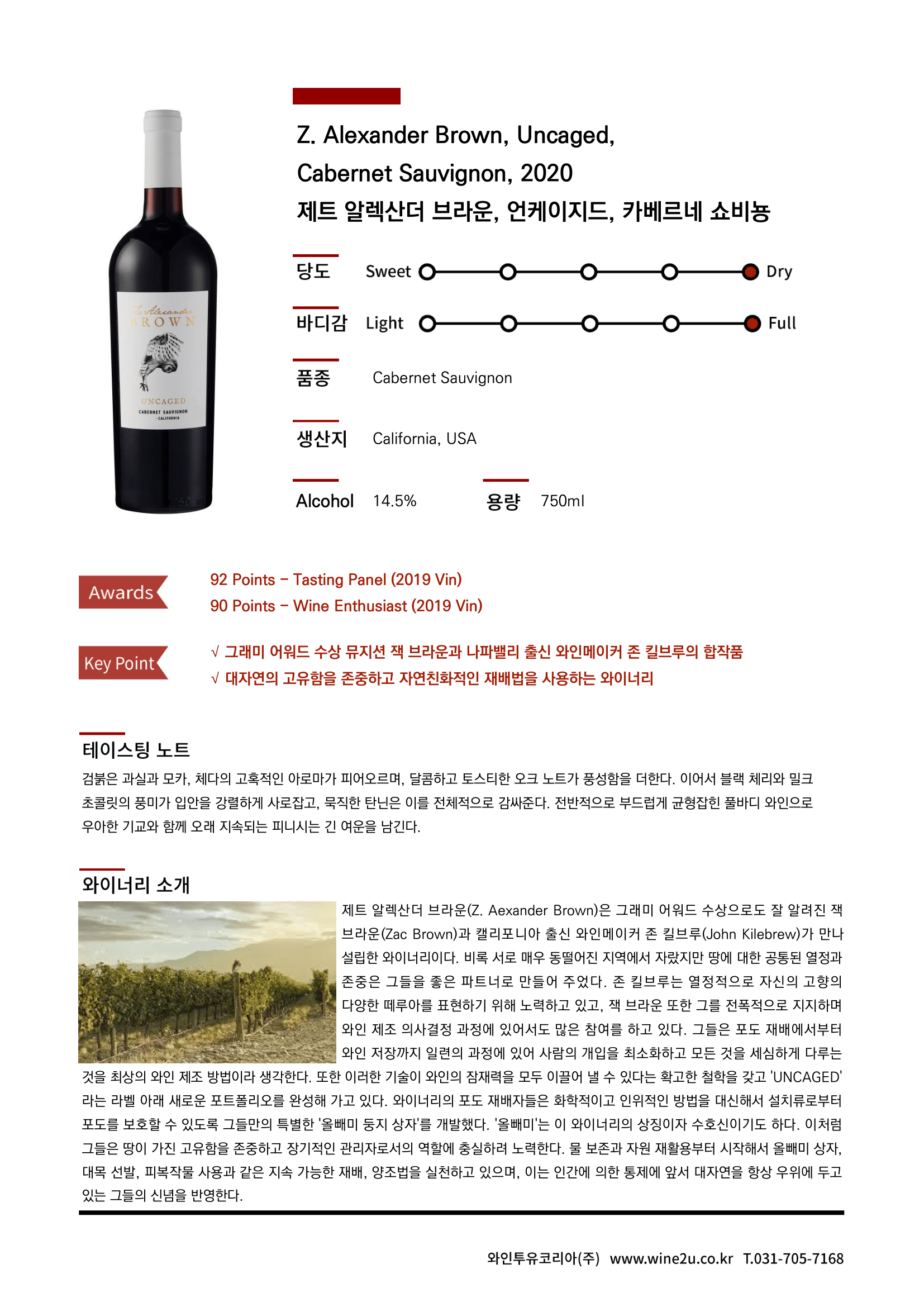 제트 알렉산더 브라운(Z. Aexander Brown)은 그래미 어워드 수상으로도 잘 알려진 잭 브라운(Zac Brown)과 캘리포니아 출신 와인메이커 존 킬브루(John Kilebrew)가 만나 설립한 와이너리이다. 비록 서로 매우 동떨어진 지역에서 자랐지만 땅에 대한 공통된 열정 과 존중은 그들을 좋은 파트너로 만들어 주었다. 존 킬브루는 열정적으로 자신의 고향의 다양한 떼루아를 표현하기 위해 노력하고 있고, 잭 브라운 또한 그를 전폭적으로 지지하며 와인 제조 의사결정 과정에 있어서도 많은 참여를 하고 있다. 그들은 포도 재배에서부터 와인 저장까지 일련의 과정에 있어 사람의 개입을 최소화하고 모든 것을 세심하게 다루는 것을 최상의 와인 제조 방법이라 생각한다. 또한 이러한 기술이 와인의 잠재력을 모두 이끌어 낼 수 있다는 확고한 철학을 갖고 'UNCAGED' 라는 라벨 아래 새로운 포트폴리오를 완성해 가고 있다. 와이너리의 포도 재배자들은 화학적이고 인위적인 방법을 대신해서 설치류로부터 포도를 보호할 수 있도록 그들만의 특별한 '올빼미 둥지 상자'를 개발했다. '올빼미'는 이 와이너리의 상징이자 수호신이기도 하다. 이처럼 그들은 땅이 가진 고유함을 존중하고 장기적인 관리자로서의 역할에 충실하려 노력한다. 물 보존과 자원 재활용부터 시작해서 올빼미 상자, 대목 선발, 피복작물 사용과 같은 지속 가능한 재배, 양조법을 실천하고 있으며, 이는 인간에 의한 통제에 앞서 대자연을 항상 우위에 두고 있는 그들의 신념을 반영한다.