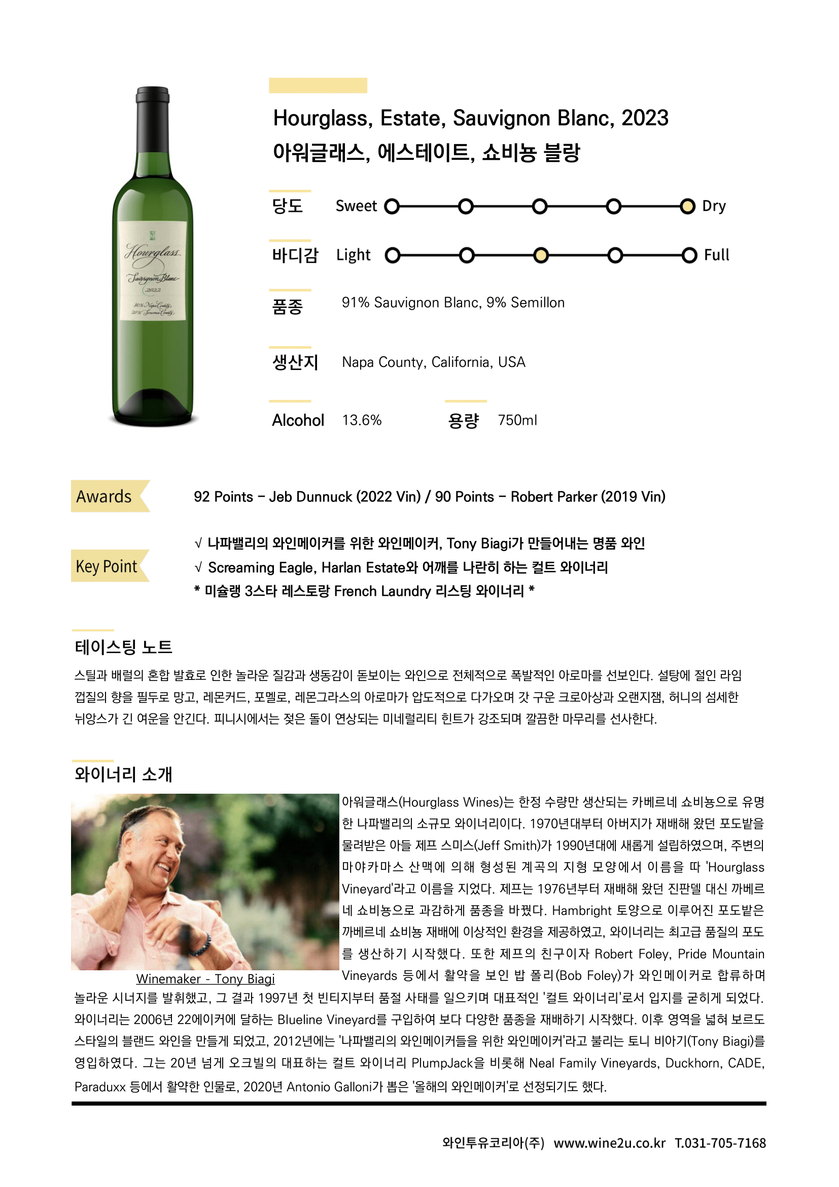 아워글래스(Hourglass Wines)는 한정 수량만 생산되는 카베르네 쇼비뇽으로 유명 한 나파밸리의 소규모 와이너리이다. 1970년대부터 아버지가 재배해 왔던