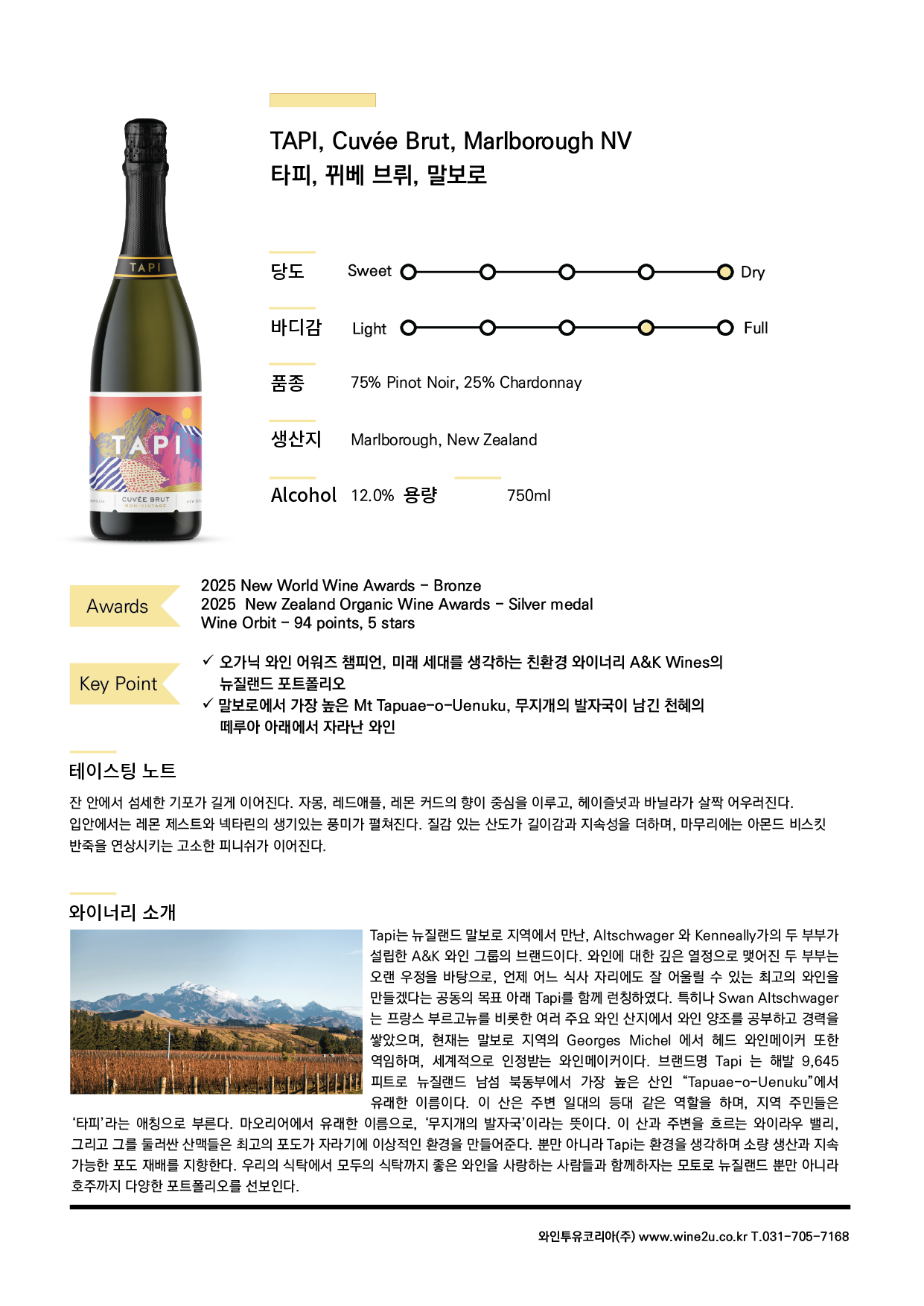 Tapi는 뉴질랜드 말보로 지역에서 만난, Altschwager 와 Kenneally가의 두 부부가 설립한 A&K 와인 그룹의 브랜드이다.