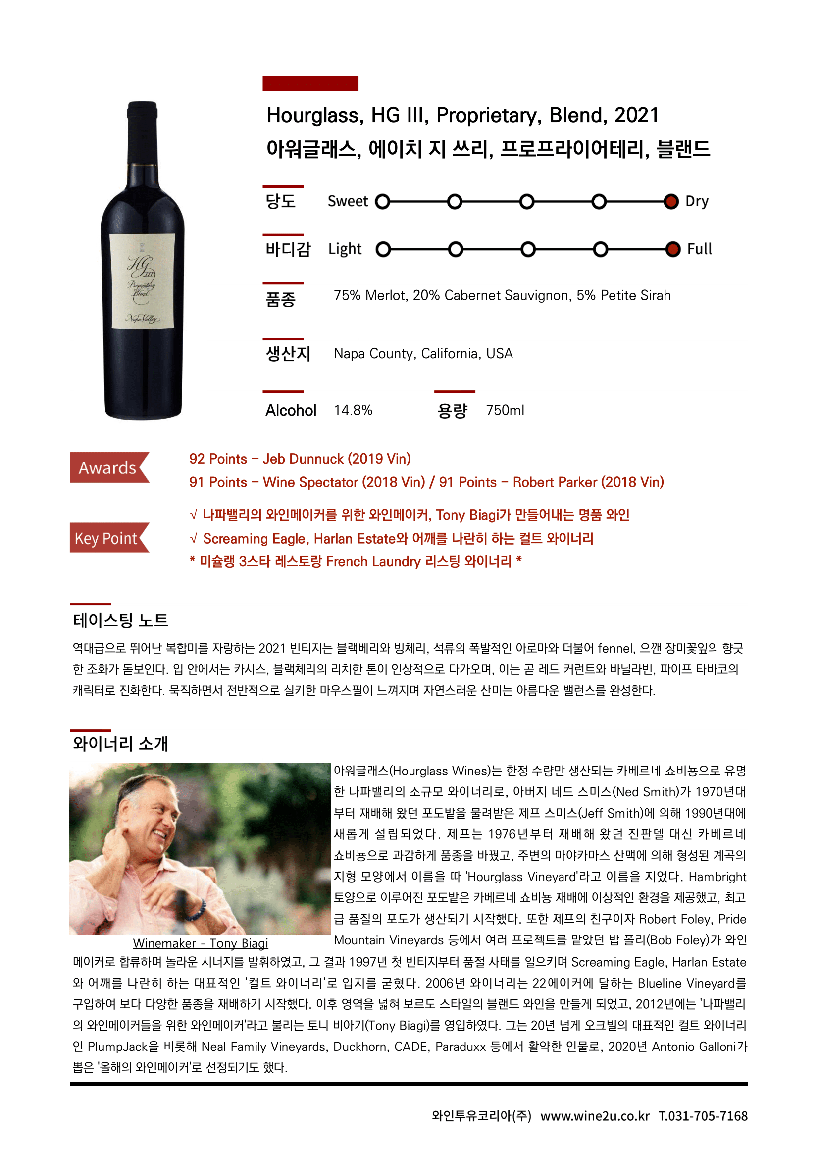 아워글래스(Hourglass Wines)는 한정 수량만 생산되는 카베르네 쇼비뇽으로 유명 한 나파밸리의 소규모 와이너리이다. 1970년대부터 아버지가 재배해 왔던